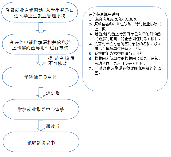 第六条 毕业生在使用协议书的过程中,若发生拟解除协议等情形,需要补发、换发协议书的,先请向学院提出申请。原则上学校仅允许毕业生最多办理一次解除协议或协议书遗失补发或协议书损坏换发。(具体流程见图)