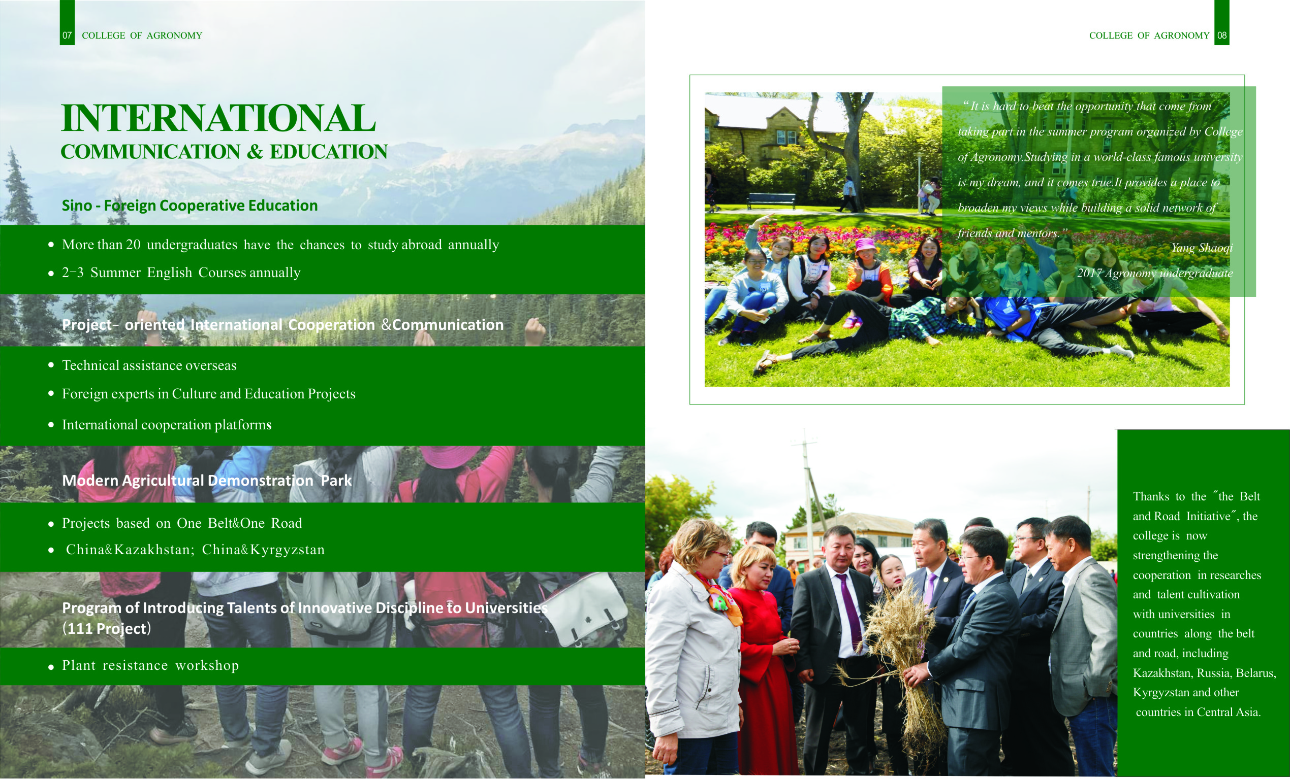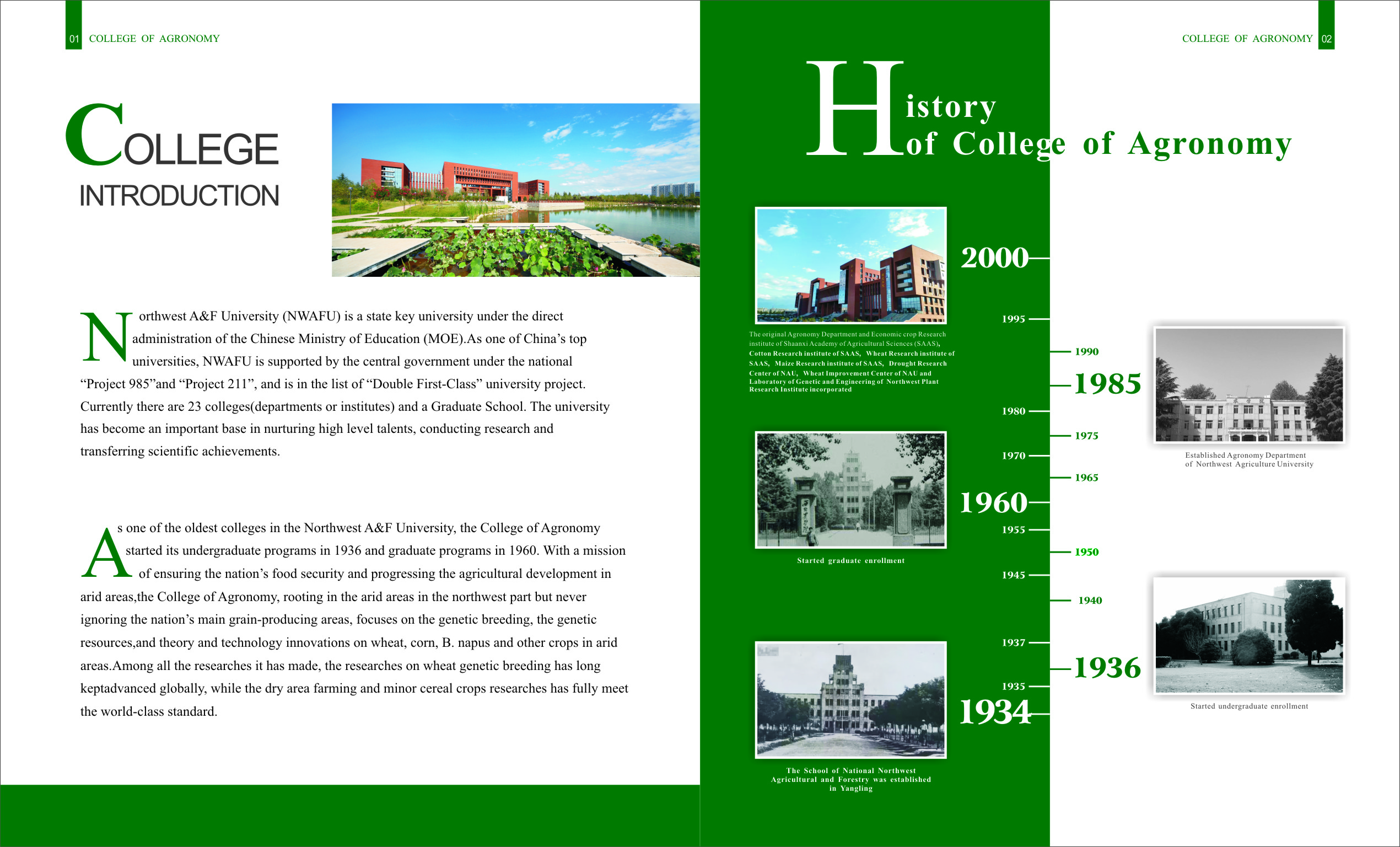 Our wheat genetics and breeding research have been a world leader. Our faculty and staff have released over 90 wheat varieties, notably varieties Bima 1, Xiaoyan 6, Fengchan 3, Shaannong 7859, Xiaoyan 22 and Xinong 979 that led four of six nation-wide rotations of varieties in the wheat belts, with cumulatively up to 1.8 billion mu (120 million hectares), which made a great contribution to food security in China. Crop Breeding, Exploitation and Planning of Agricultural and Natural Resources chaired by our faculty have been among the best national textbooks. Our research on agricultural production regional development in arid areas, the utilization of wheat hybrid vigor, and minor grain are also internationally highly ranked. The crop root research apparatus designed by our faculty, was elected in American encyclopedia of Soil Science in 2015. In 2012, we established the prestigious WheatBbiology Innovation Platform, jointly with China Agricultural University and Huazhong Agricultural University. We are the host of three academic journals, Journal of Triticeae Crops, Agricultural Research in the Arid Areas, and Acta Agriculturae Boreali-occidentalis Sinica.