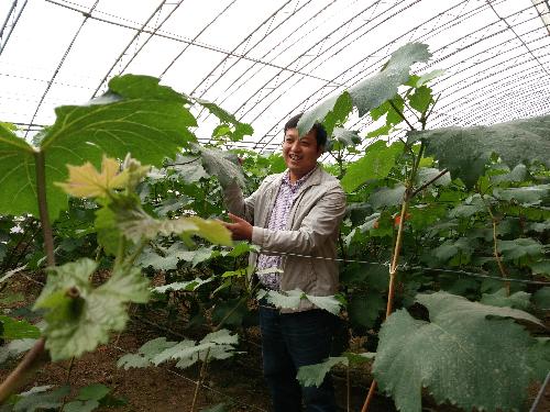 队长苟晓楠首先联系到了合作社理事长——李海平大叔。李大叔非常欢迎大家的到来,在经过简单的寒暄后,李大叔带着田园使者们走进了大棚。来到大棚,李大叔向队员们悉心讲解了现在葡萄的生长情况,介绍了不少葡萄生长的知识,队员认真听讲,不时就一些问题提问大叔,大叔均予以细致的回答,让大家学到不少东西。
