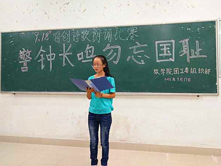 2016年9月18日是“九·一八”事变85周年,为了大力弘扬爱国主义精神,教育广大学生勿忘国耻、奋发图强,农学院团工委组织部在北校区六号教学楼6B43教室开展了纪念‘九·一八’“警钟长鸣,勿忘国耻”的原创诗歌朗诵活动。
