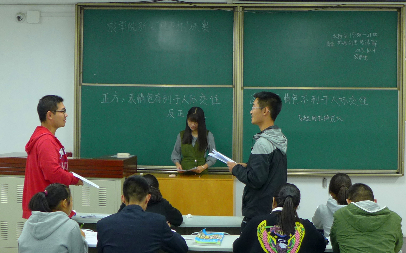 2016年10月9日晚,农学院2016“稷下杯”新生辩论赛决赛在北校区八号教学楼8218举行。农学院辩论队11级华冠勋、12级刘益宏、13级王豪乐及水建学院,园艺学院,机电学院的15级队长、总务、领队担任评委。