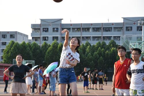 比赛中场休息,双方各派出五名女生进行投球大赛。每人站在罚球线投五个球,进一球记一分,最终加到总分。观众凝视着篮框,每一次投球都扣人心弦,每一次进球都引来一片热烈的掌声。