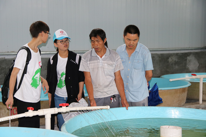最后队员们来到了当地的鱼塘,在鱼塘负责人的带领下参观了育苗室和鱼池,了解了鱼塘的养殖规模、养殖条件和养殖方式,鱼塘现在主要是个体经营,以鲟鱼为主要养殖品种,四季销售鱼苗、成鱼。