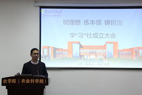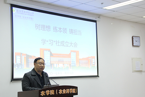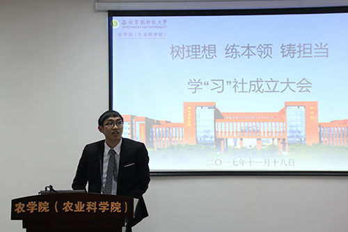 2017年11月18日下午两点,农学院习近平新时代中国特色社会主义思想学习社(以下简称学“习”社)成立大会在南校区农科楼隆重举行,会议邀请到了农学院党委副书记兼副院长张海成老师以及马克思主义学院指导老师王建辉老师就学“习”社成立和发展做了重要讲话。此外,由学习社社长刘涵宇宣读学习社章程,社员代表朱志远发言。