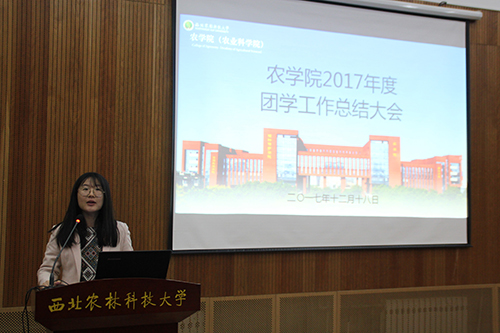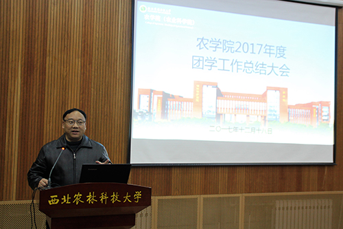 2017年12月18日晚,农学院2017年度团学工作总结大会于南校区农科大楼阶梯会议室举行。农学院党委副书记兼副院长张海成、农学院团工委书记高雪纯、农学院团工委学生会主席团成员、各部门部长及部委参与本次会议。会议上,学生会主席李雨欣及各部门负责人做了详细的年度总结汇报,党委副书记张海成、团工委书记高雪纯做重要讲话。