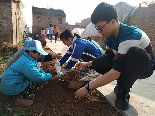听完志愿者的讲解,小朋友们对种植植物更加感兴趣,纷纷拿出准备好的工具,握着种子,牵着志愿者的手,前往村外土地肥沃之处挖掘土壤。不一会,志愿者和小朋友们便带回了好几盆沃土。在志愿者的帮助下,小朋友在备好的花盆里装上三分之二的土壤,挖出一个小坑,将种子撒进花盆里,再在其上覆上一层薄薄的略干的土。如此,一盆植物便播种好了,只待夏日到来,万花盛开。当然,期间定少不了小朋友们悉心地灌溉照料。