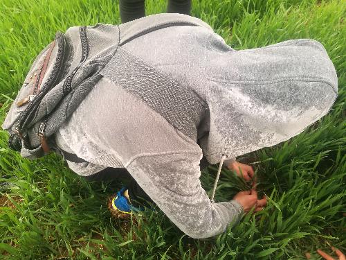 放眼望去,麦田里一片郁郁葱葱的绿意,小麦长势喜人。杂交组的成员们正聚集在自己的麦田,不顾风雨,专心致志地数着分蘖数。本在大家出发的时候是淅淅沥沥的小雨,渐渐雨滴却大而密起来。但大家已经顾不上拿伞了,手因为拨动麦苗沾满了雨水和泥土,脚上也踩了满脚的泥,但大家最关心的是,尽量保护脚下的麦苗不受伤害。长达一个多小时,大家中午将一亩多的四块田地小麦春季分蘖数分别统计记录清楚,完成了今天的任务。