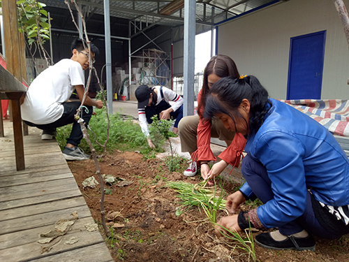 立夏已至,天上飘着蒙蒙细雨,合作社的杂草却愈发旺盛。使者们率先把合作社内所有土地的杂草清理干净,因为有水的缘故,大家手上都沾满了泥却毫不在意,反而面面相望会心地笑着。负责人李女士在检查完他们的工作后,也不由得露出笑颜,紧接着她拿出了一捆小葱和几把小铁锹,耐心地指导同学们栽种葱苗。同学们模仿着李女士的操作,很快就把葱苗都栽完了。洗手过后,雨并没有停歇的迹象,于是李女士打算让同学们在棚子底下避会儿雨,但是秦凝同学却说:“我们来这里就是来干活的,阿姨您都没歇着,我们当然没问题。”在同学们的坚持下,李阿姨为他们安排了最后一项任务。三个队伍很快便对任务做出了明确的分工,系绳、插杆、剪枝等流程在队长的指挥下有条不紊的进行着。李阿姨在一旁看着劳动的同学们不时地指导一番,然后就放心的忙自己的事情去了。
