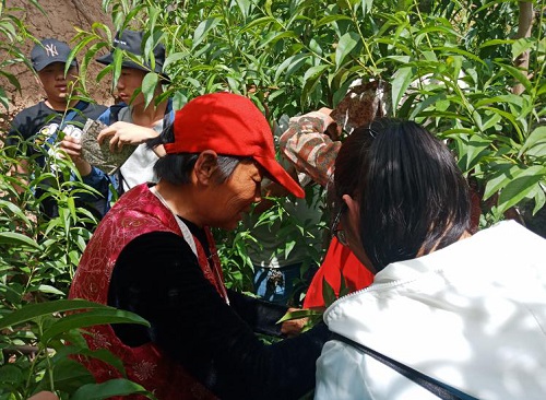 下午三点,田园使者队伍按时到达了合作社,并与合作社负责人对接成功。在交流接洽后,负责人带队员们进入桃树种植基地和工作人员共同进行幼桃套袋处理。队员们了解到桃树果实套袋可以促进果实着色,防止裂果,保持果面洁净,防止病虫为害,减少农药残留,并能提高果实硬度。在工作人员的悉心指导下,认真的队员们也很快就学会了套袋技术并能熟练掌握和应用套袋的技巧。烈日炎炎下,汗水挥洒,小小的桃子一个接一个的都慢慢被塞进了袋子里。在队员们和工作人员共同合作下,极大地加快了桃树套袋处理的进程。