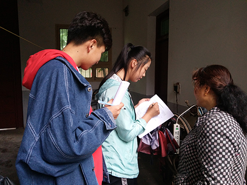 调研活动开始前,代家坡村扶贫办负责人赵文生书记向同学们介绍了代家坡村的基本概况。在认真聆听完书记的详细介绍之后,同学们便开始入村,正式开始调查。代家坡村庄主道为十字形,村户的房屋整整齐齐地分布在道路两边。此时的风雨还是很大,但同学们并没有退缩。敲门,介绍,询问,交谈,同学们以问卷为基础,发散性地向村民询问村庄的现状、家庭的状况、个人的发展。从对十九大的了解到乡村振兴战略的普及,从产业兴旺到生活富裕,从生态宜居到乡风文明,同学们根据问卷,向村民询问生产生活各个方面状况,并在交谈中感受乡村发展。几近两个小时的时间,同学们走家串户,全面地对代家坡村进行了调研。走访结束,同学们又再次回到了村委,着手问卷的整理归类。在集体讨论完问题之后,我们将问卷以及整理的想法建议交给了赵文生书记,并与书记进行了短暂的交谈,分享学习。