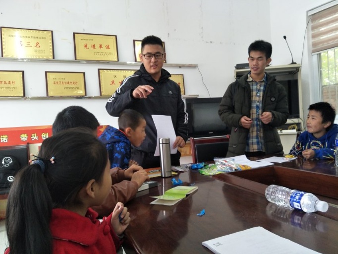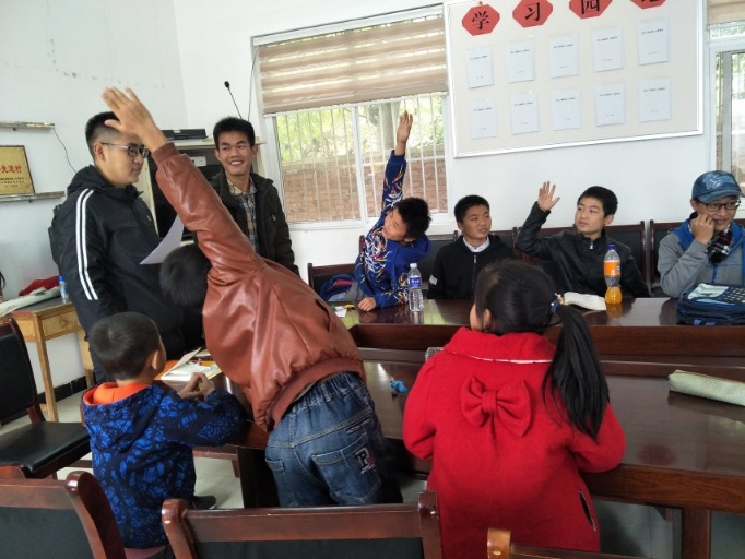 “故事大会”环节的设置以向小朋友们分享重阳节相关神话传说的形式,让小朋友们更进一步地了解重阳节精神文化,使他们对古人的思想有较为基础的认识。甘书铭、闵远昌、齐倩、潘依琳、贾晓雯等几名支教队员和孩子们分享了他们准备的故事,以及他们自己对于故事的见解。这不仅使小朋友们增长了知识,还使队员与孩子们的关系更加亲近。支教队员与小朋友们之间逐渐培养起来的感情,为这次活动重添了一抹新的友谊色彩,也为下一个环节默契程度的考验奠定了情感基础。