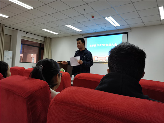 为加强思想教育,准确开展大学生政治理论集体学习活动,2019年11月24日下午,农学院2017级本科生在农科楼216报告厅以年级大会的形式开展了学习活动,本次活动由2017级辅导员帕尔哈提老师主持开展。