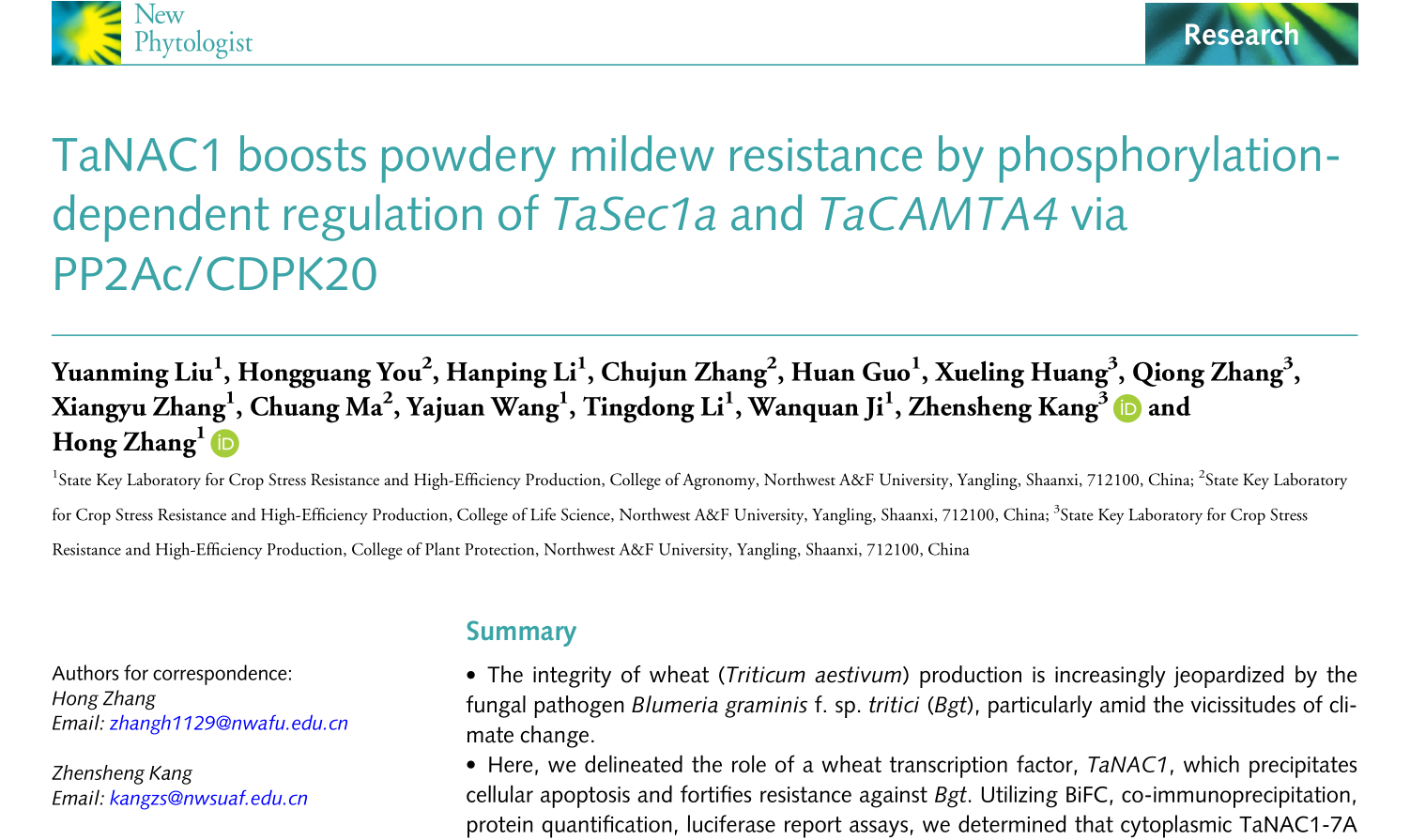 近日,张宏研究员团队在《New Phytologist》发表题为“TaNAC1 boosts powdery mildew resistance by phosphorylation-dependent regulation of TaSec1a and TaCAMTA4 via PP2Ac/CDPK20”的研究论文,该研究以多组学数据分析挖掘到的小麦转录因子TaNAC1为切入点,揭示了其在小麦抗白粉病中的遗传基础和作用机制;解析了该基因亚基因组同源基因的功能性遗传差异,并阐明了其调控细胞凋亡和增强抗病性的作用机理。农学院博士研究生刘圆明为论文第一作者,张宏研究员和康振生教授为论文通讯作者。