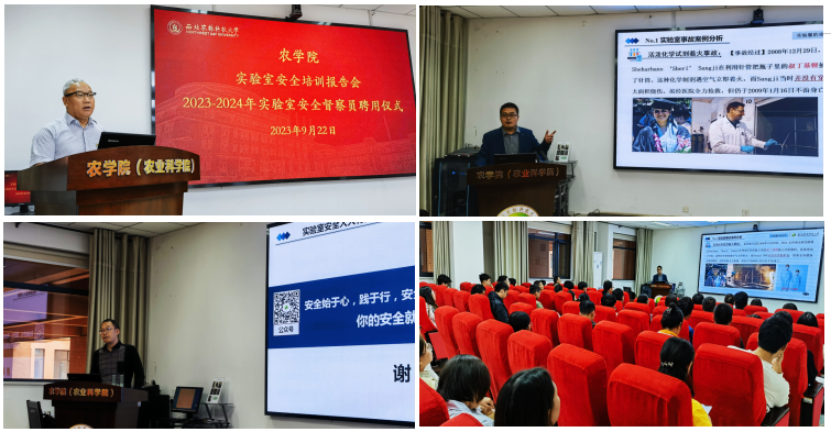 为持续提升农学院实验室安全管理水平,加强实验室安全督导,及时消除安全隐患,营造良好的实验环境和学习环境,我院于9月22日举办农学院实验室安全培训报告暨2023年-2024年学实验室安全督察员聘用仪式。实验室安全与条件保障处副处长纪克攻、农学院党委书记张海成,学院安全督导小组教师及研究生50余人参加会议,副院长王磊主持会议。