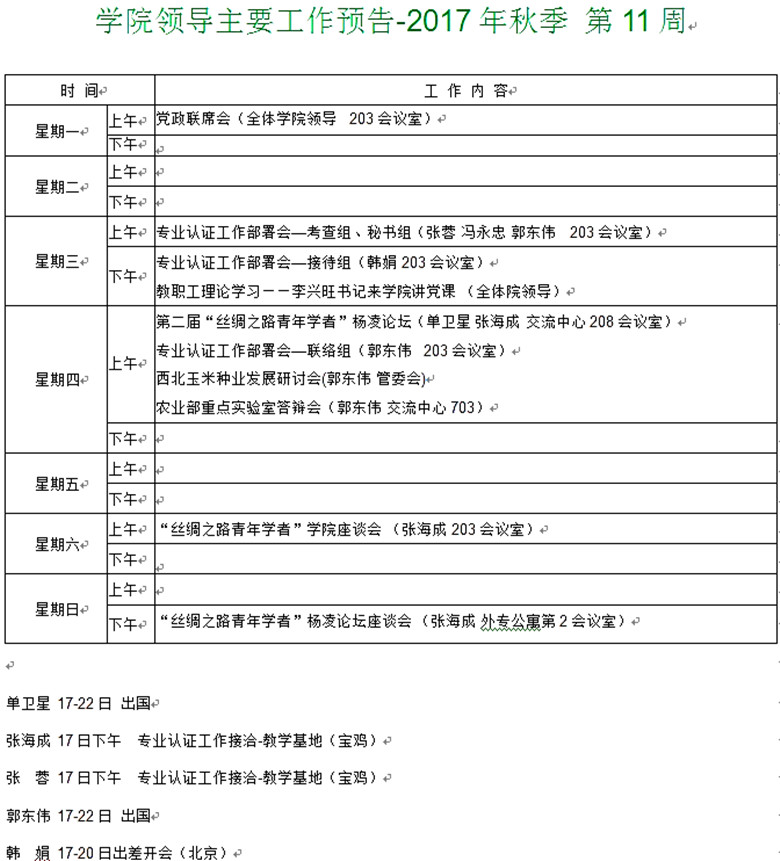 学院领导主要工作预告-2017年秋季 第11周