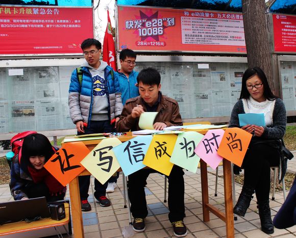 活动的前期宣传于11月初启动,研究生会通过QQ群、微信和微博的方式大力宣传,得到广大研究生的积极响应,手写书信成为同学们讨论的焦点,现场写信、投递活动于11月8日在南校区南苑餐厅门口举行,醒目的标语和一位同学的激情演唱顿时吸引来大量同学参与。有的同学拿起笔来一挥而就,有的则带上纸笔另觅场所细心书写,他们将写好的信封装、填上地址交给工作人员。活动持续八个小时,收到信件近300封。