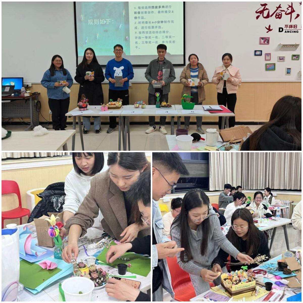 活动于晚上开始,各团支部的成员们携带着搜集的塑料废品踏入现场,团员们将利用创造力让旧物闪耀起来。在活动现场,首先进行了环保知识竞答,以加深团员们的环保认识,巩固对环境问题的理解。随后,多肉植物手工改造活动展开,参与者们积极投入到手工创作中,将多肉植物与各式废旧容器相结合,并添加各种装饰物,使作品更加生动有趣,每一件作品都独具匠心,体现参与者的绿色环保理念,活动现场洋溢着创意和欢乐的氛围,每个人都在享受着手工创作的乐趣。制作完成后同学们对作品进行了互评打分,支委结合两项活动得分对参赛组进行了评选,并颁发了奖项。