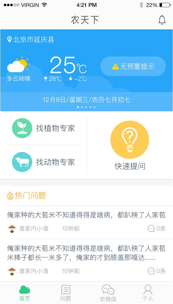 “农天下”手机APP为面向全国农学院协同发展联盟帮扶地区广大农户提供在线农技问答、及时通讯交流等三农服务的综合平台。