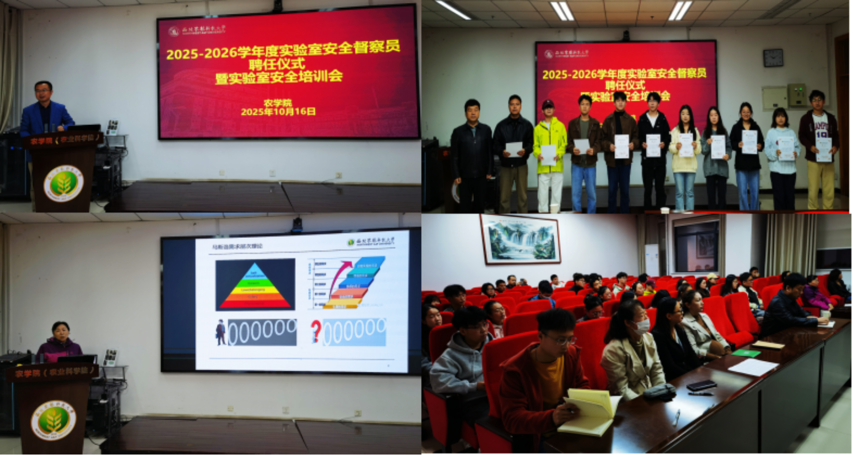 为持续提升农学院实验室安全管理水平,强化实验室安全督导队伍建设,创造良好安全科研环境,我院于10月16日举办2025-2026学年安全督察员聘用仪式暨安全培训报告会。实验室安全与条件保障处副处长李论、农学院副院长黄镇、学院实验室负责老师及安全督导组成员、研究生督察员近50余人参加会议。
