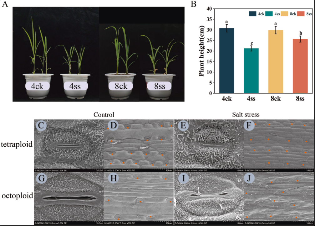 盐碱地是全球农业生产面临的主要挑战之一,对作物生长和产量影响显著。多倍体植物通常表现出更强的耐盐性,然而,多倍体糜子适应盐胁迫的具体机制仍不明确。本研究以四倍体和八倍体糜子为试验材料,探究它们在120mM盐胁迫下的响应机制。