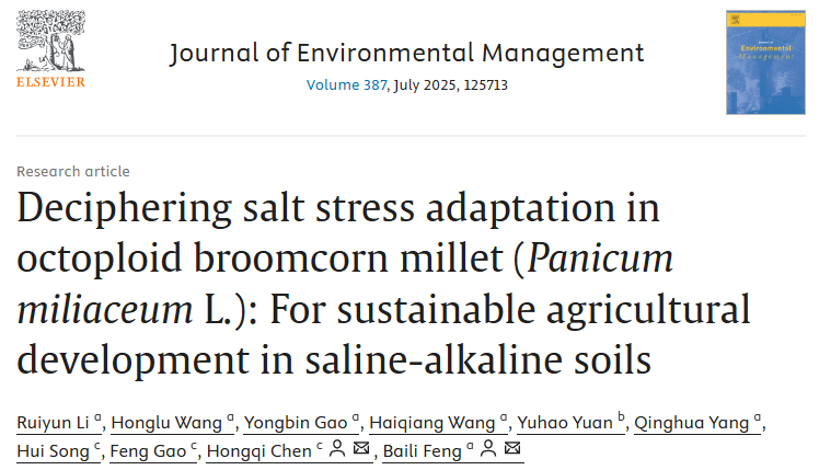 近日,开云官方在线入口特色杂粮科技创新团队在国际期刊《JOURNAL OF ENVIRONMENTAL MANAGEMENT》发表题为“Deciphering salt stress adaptation in octoploid broomcorn millet (Panicum miliaceum L.): For sustainable agricultural development in saline-alkaline soils”研究论文。我院2022级硕士生李瑞云为论文第一作者,冯佰利教授为论文通讯作者。