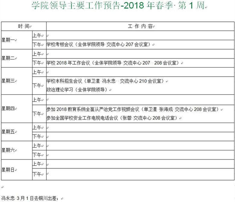 学院领导主要工作预告-2018春季 第1周
