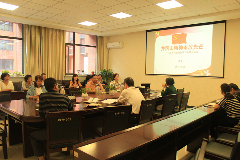 学院党委副书记张海成作为一名普通党员参加了行政党支部党员大会。结合暑期在井冈山参加培训学习情况,张海成和大家分享了井冈山斗争的历史、对井冈山精神的理解以及对“四个自信”中文化自信的理解,他指出,以井冈山精神为代表的红色文化是文化自信中非常重要、不可或缺的组成部分,是国家和民族宝贵的精神财富,值得每个共产党员深入研究和学习。