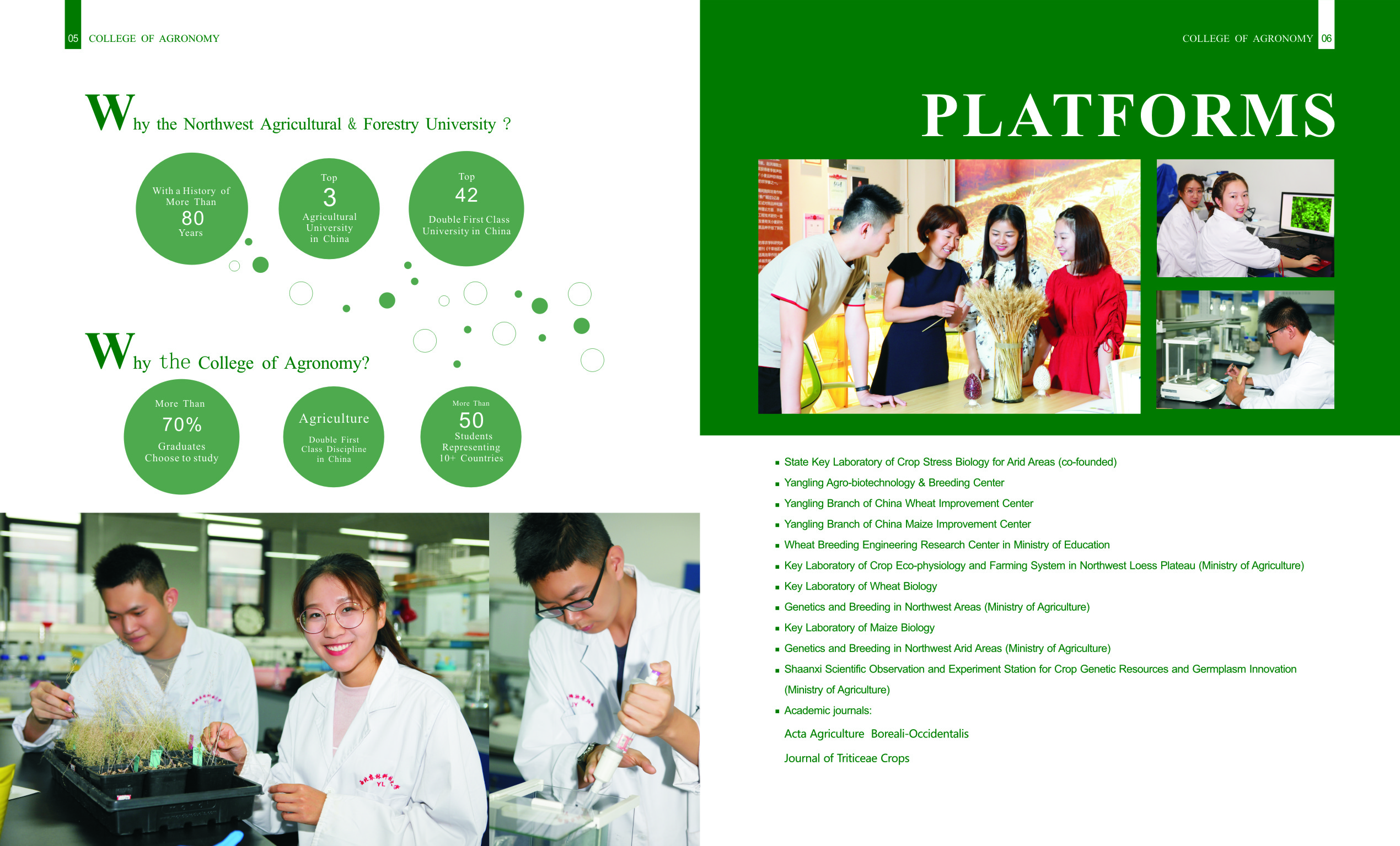 Our wheat genetics and breeding research have been a world leader. Our faculty and staff have released over 90 wheat varieties, notably varieties Bima 1, Xiaoyan 6, Fengchan 3, Shaannong 7859, Xiaoyan 22 and Xinong 979 that led four of six nation-wide rotations of varieties in the wheat belts, with cumulatively up to 1.8 billion mu (120 million hectares), which made a great contribution to food security in China. Crop Breeding, Exploitation and Planning of Agricultural and Natural Resources chaired by our faculty have been among the best national textbooks. Our research on agricultural production regional development in arid areas, the utilization of wheat hybrid vigor, and minor grain are also internationally highly ranked. The crop root research apparatus designed by our faculty, was elected in American encyclopedia of Soil Science in 2015. In 2012, we established the prestigious WheatBbiology Innovation Platform, jointly with China Agricultural University and Huazhong Agricultural University. We are the host of three academic journals, Journal of Triticeae Crops, Agricultural Research in the Arid Areas, and Acta Agriculturae Boreali-occidentalis Sinica.