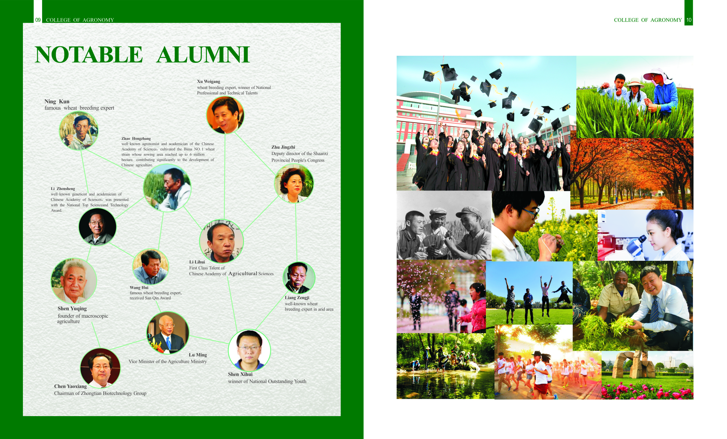 We have trained over 14,000 graduates since the establishment of Crop Science. Many graduates have played important roles in academic institutes, government departments, and industries, and contributed significantly to national agricultural development and food security. Some notable graduates include LU Ming, former Vice Minister of Agriculture, ZHU Jingzhi, deputy director of the People's Congress of Shaanxi Province, YU Shuxun, an academician of the Chinese Academy of Engineering, WANG Hui, the winner of the Highest Achievement Award in Science and Technology in Shaanxi Province, LI Lihui, outstanding talent of Crop Science in the Chinese Academy of Agricultural Sciences, LIANG Zengji, famous breeder of dryland wheat, XU Weigang, winner of the National Outstanding Professional and Technical Personnel, and CHEN Yaoxiang, winner of the National May 1st Labor Medal,