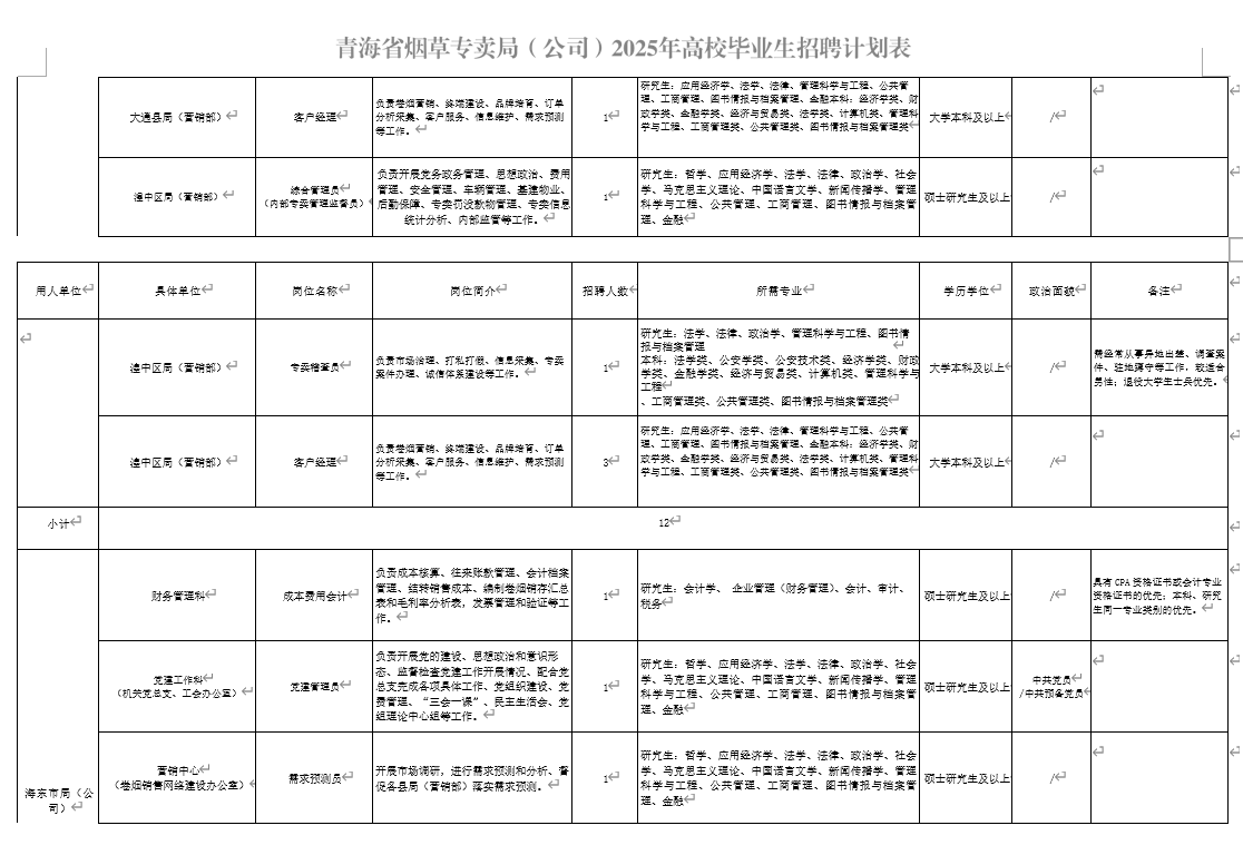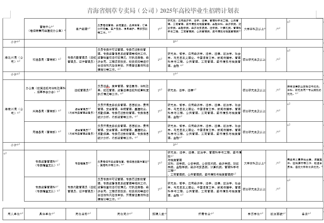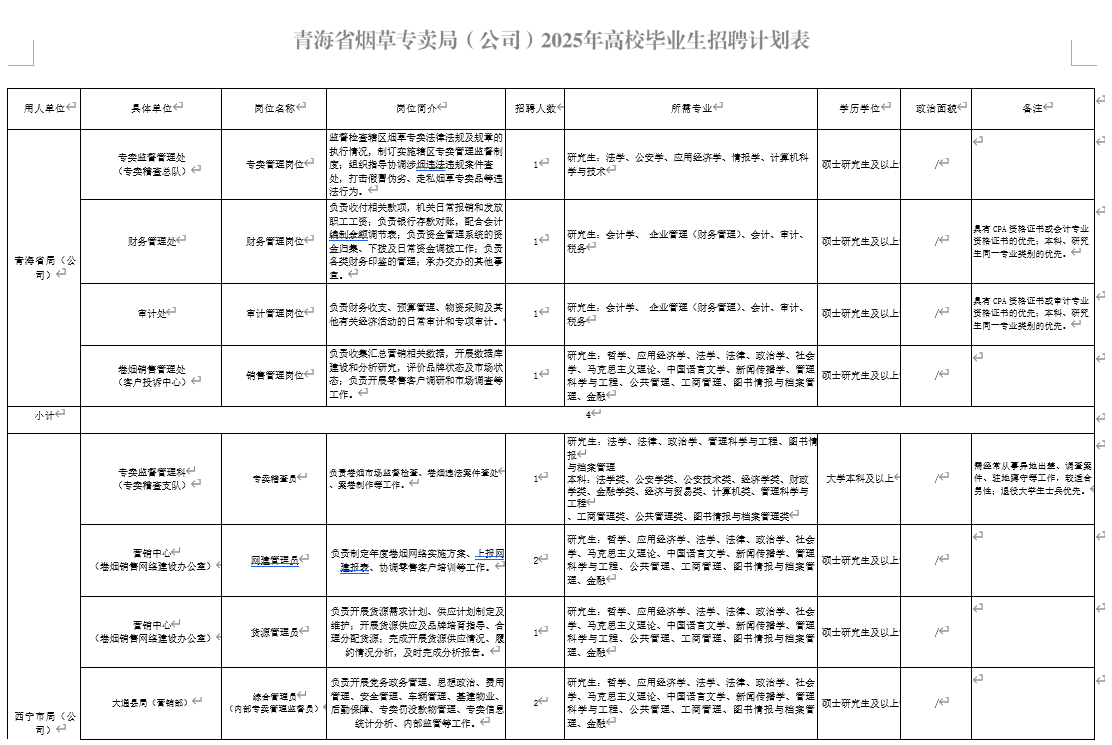 根据发展需要,青海省烟草专卖局(公司)及所属西宁、海东、海西、格尔木、海北、海南、黄南、玉树、果洛等9家市(州)烟草专卖局(公司)和青海烟草物流中心,本着公开、公平、公正、择优的原则,现面向社会公开招聘高校毕业生,具体事项公告如下: