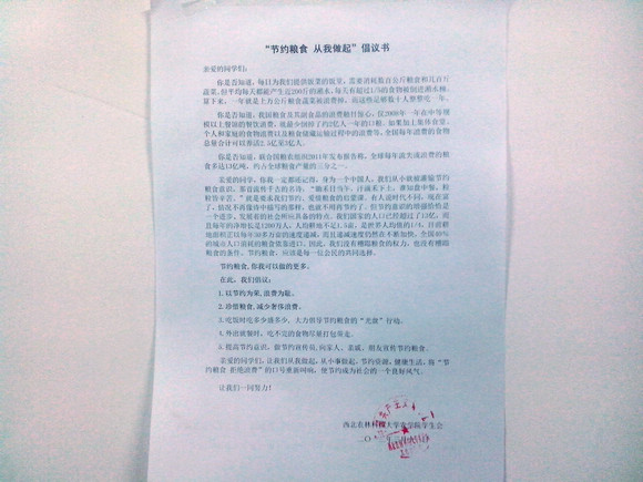 一粥一饭,当思来之不易;半丝半缕,恒念物力维艰。3月11日和12日中午,农学院学生会在北校区东区宿舍区和西区宿舍区分别开展了“我青春我节约 我时尚 我光盘”主题倡议活动,并代表所有农学院学子向全校发出了“节约粮食,从我做起”的倡议书。