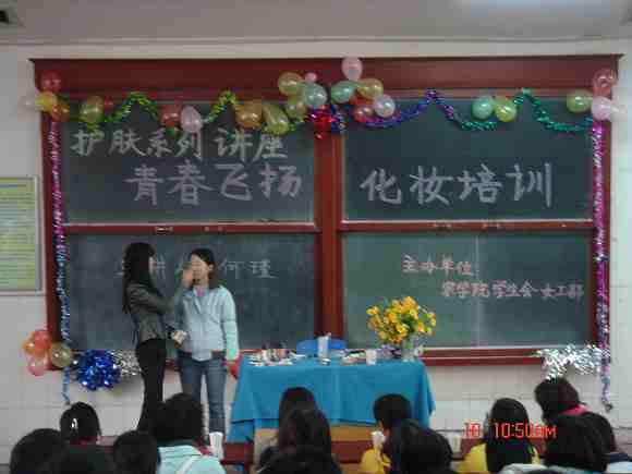 11月10日,农学院学生会女工部组织的肤系列讲座之“青春飞扬——化妆培训”在4101室举行。由鑫雨西安鑫雨美妆的何瑾化妆师主讲,本次讲座吸引了各学院部分喜爱化妆的同学。