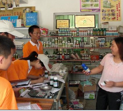据了解,先正达公司多年来一直致力于农药的安全使用及病虫草害的防治宣传工作,在历年科技下乡中受到农民朋友的热烈欢迎。图为先正达公司的志愿者在眉县青化乡的一个农药店里向店主咨询农药的销售情况。 肖靖 管君 摄