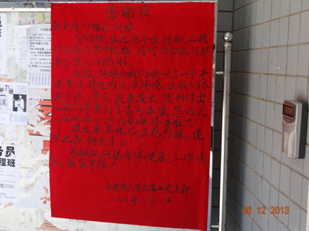 农学院大学生第五党支部的同志们说:“吃水不忘挖井人,是我党的光荣传统,作为学生党员,学会感恩才会有更积极的人生观,才会有更健康的心态。两年来,叔叔、阿姨为我们提供了一个干净、整洁、舒适的生活环境,让我们在这里安心学习,健康成长。同时,给予我们家长般的关怀,免去了我们父母的担忧,我们衷心地感谢他们。”