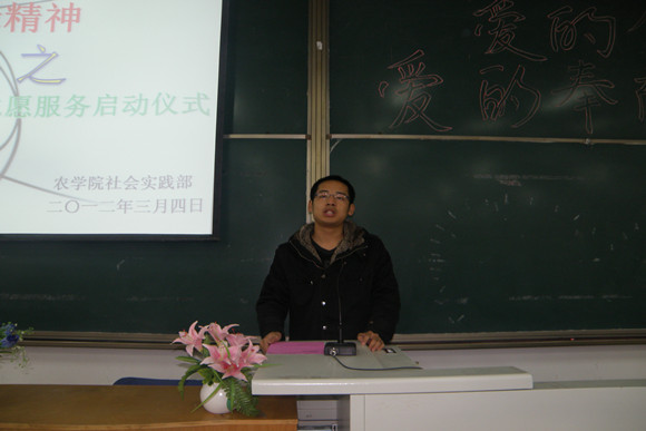 3月4日上午,我院于8T07教室举行了“传承雷锋精神之社区志愿服务”启动仪式。农学院团工委书记梁子龙、辅导员王娜,林杰、西农家属区的退休教职工代表、学生会主要学生干部及我院80余名志愿者参加了本次启动仪式。