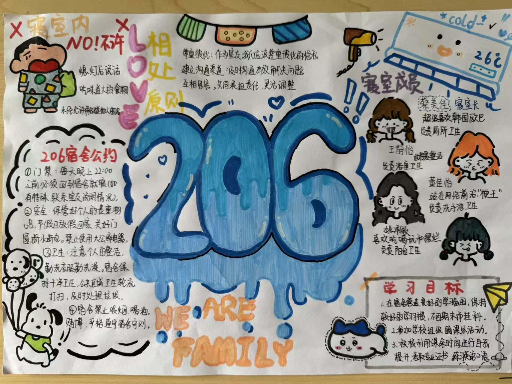 活动推出后,共有53间寝室设计了寝室公约,这些寝室公约幽默中透露着温馨,调皮又不失友爱,简约而不失大气,华丽而不失温婉。以言语书写温情,以行动展现感情,平淡之中彰显了寝室命运共同体这一理念。