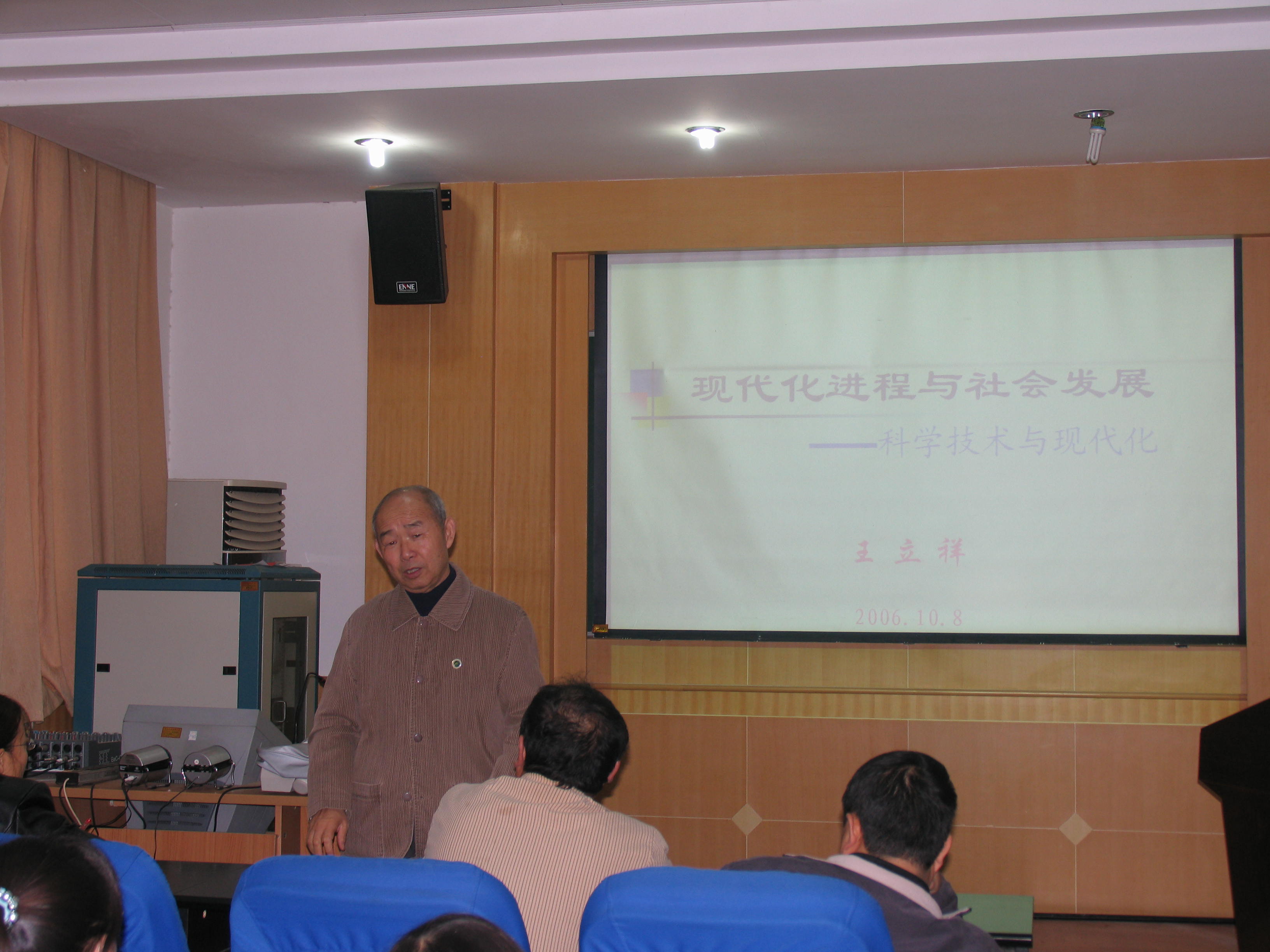 10月12日, 王立祥教授在学院多媒体室为我院科教人员做了题为《现代化进程和社会发展》的报告。报告以翔实的数据、生动的图片、精辟的语言全面诠释了“现代化”的基本内涵。回顾了人类社会发展进程,评述了我国在世界现代化进程中的现实地区,分析了我国现代化地区间不平衡的根本原因,明确了我国现代化发展时期的战略布局,指出了科学技术在现代化进程中的重要作用。