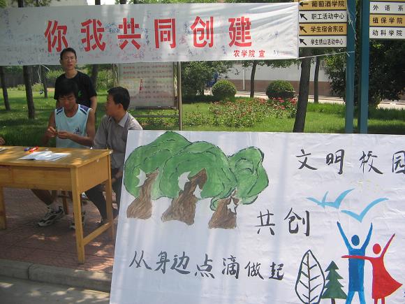 自我校开展创建文明校园以来,农学院全院高度重视,学院党政领导多次召集学院各部门会议,全面部署安排创建省级“文明校园”的各项工作。学院团工委学生会也开展了各项教育活动,将该项工作逐步推向深入。先后举行了以“让文明之花在校园绽放”为主题的大型宣传活动、校园图书飘飘、“美丽西农、爱心呵护”为主题“五个文明”大型实践活动、“树诚信之风”大型活动之––诚信签到宣誓、开展了诸如诚信座谈会、主题辩论赛、主题征文、诚信签到、“校园十大不文明行为”评选、校园节水行动调查、“诚信柿子”、诚信考试大型签名活动,旨在使“五个文明”深入人心,树立良好的学风校风,从而推进我校省级“文明校园”创建活动的顺利开展。这些活动对于加强学生的诚实守信意识,弘扬当代大学生的诚实守信精神,树立正确的社会主义人生观具有重大意义,也为我校建设文明校园打下了重要基础,有力的配合了我校文明校园的创建工作。