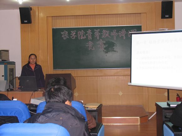 11月28号下午,学院在多媒体实验室举办了青年教师讲课竞赛活动,作物育种、植物生产、种子工程、遗传、耕作与生态教研室的11名青年教师参加了竞赛。参赛的11名教师高度重视,精心准备,认真备课,有的老师使用板书,循序渐近,层层推理;有的老师应用多媒体课件,层次清楚,一目了然;有的老师板书与多媒体课件生动结合,充分展现了讲课艺术。参赛课程涉及专业基础课、专业基础选修课、专业课、专业选修课和全校公共选修课。