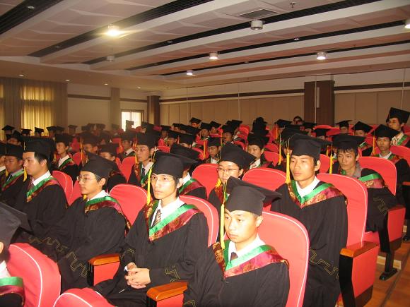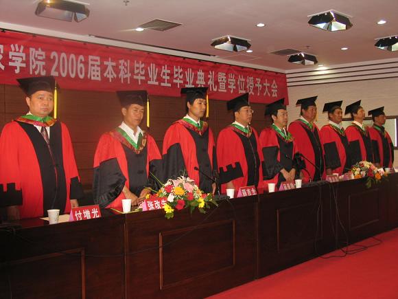 会议在雄壮的国歌声中开始,随后,付增光副院长宣读了2006届学士学位授予决议,贾志宽院长发表了热情洋溢的讲话,他代表院党委、院行政对即将踏上新的人生征程的毕业生表示热烈的祝贺和衷心的祝愿,同时也提出了四点希望:1.尽快改变角色,适应社会;2.学会在社会的大课堂中学习;3.诚信做人,踏实做事;4.记住母校、关注母校。随后,毕业生代表王晓东、指导教师代表张保军">张保军教授相继发言,惠安堂副书记宣读了获得2006届优秀本科毕业论文学生名单。吴普特副校长、贾志宽院长、薛吉全书记、张改生">张改生教授、王辉">王辉教授、何蓓如教授为毕业生颁发了学位证书、拨穗,最后全体师生齐唱校歌。