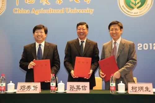 农业部副部长、中国农科院院长李家洋,教育部科技司司长王延觉,中国科学院院士吴常信、张启发、武维华,在京部分高校主管校领导,玉米水稻小麦生物学协同创新中心管理委员会成员以及组建培育期中心主任和平台主任,3所高校的校长、主管副校长及科研管理部门和相关学科方向专家教授等出席会议。中国农业大学校长柯炳生、我校校长孙其信、华中农业大学校长邓秀新共同签署中心组建协议。