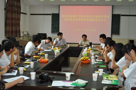 7月2日,浙江大学农业与生物技术学院研究生党员代表团一行8人来到我院进行访问交流。学院党委书记惠安堂,党委副书记马志宏、党务秘书赵普庆,学工秘书彭小凤,辅导员王娜以及学院研究生党员代表参会分别参加了有关活动。
