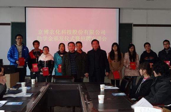 2012年12月21日下午,在我院设立助学金的京博农化科技股份有限公司在学院会议室举行了“京博农化助学金”颁发仪式,公司经理赵重峰校友一行三人、学院党委书记惠安堂、党委副书记马志宏、学院辅导员及近30名受助和部分毕业班学生参加了仪式,仪式后公司举行了招聘会。