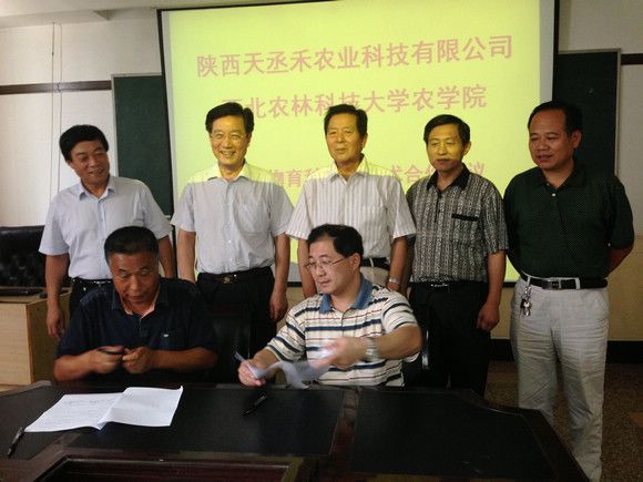 陕西天丞禾农业科技有限公司则为学院在渭南无偿提供开展作物育种、栽培等方面的科学研究、教学实习、生产实习的场所;无偿提供不少于30亩的农作物育种、栽培和品种鉴定的试验基地;常年有偿聘请农学院的农作物育种,栽培等专家做技术指导;并对学院培育的育种材料、作物品种实行有偿使用,并约定凡在基地育成的材料和品种成果等知识产权第一归属单位为西北农林科技大学。