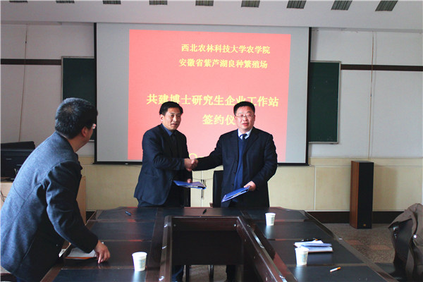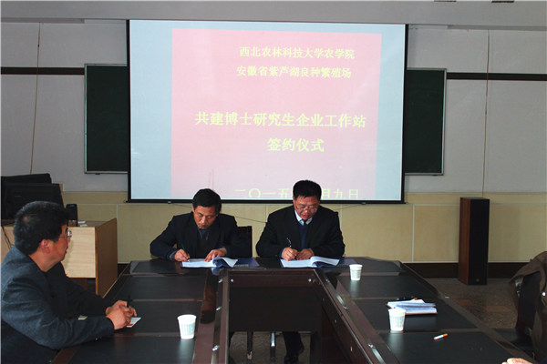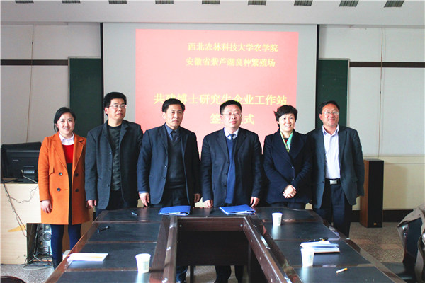 4月9日下午,我校农学院与安徽宿州紫芦湖种业共建的企业研究生工作站签字仪式在农学院会议室举行。宿州市农业委员会常务副主任段梅、宿州市农业科技示范园管委会主任岳继周、宿州市�桥区农业委员会主任张庆伟、宿州紫卢湖种业总经理晁林海、宿州市农业委员会科长周澍、农学院党委书记惠安堂、农学院副院长奚亚军共同出席了签字仪式。双方在建立农作物科研工作站、企业研究生工作站和农作物新品种技术转化推广等方面达成了共识,这标志着我校农学院在校企联动,搭建战略合作平台的工作中又上新台阶。