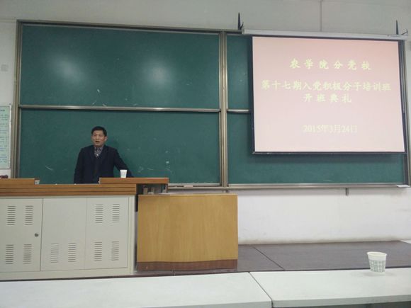 3月24日晚,农学院分党校第17期入党积极分子培训班开班典礼在北校区8T03教室成功举行。学院党委书记惠安堂老师、校党委宣传部副部长兼新闻中心主任闫德忠老师了出席本次开班典礼。典礼由学院党务秘书廖代卿老师主持,135名学员参加了典礼。