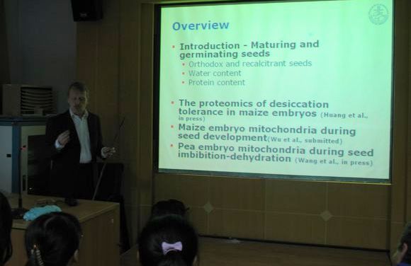 10月11日上午,在农学院二楼多媒体,来自丹麦奥尔胡斯大学农业科学学院遗传和生物技术系Ian Max Møller 教授、中国科学院植物所程红焱副研究员、中国科学院植物研究所研究员宋松泉博士为广大师生分别做了题为“Approaches to study seed desiccation tolerance”、种子休眠与萌发的研究进展、种子顽拗性及其种质资源的长期贮藏的报告,来自农学院、生命学院、园艺等学院近70余名师生参加了报告会。会后,Møller 教授同学院师生进行了座谈,在学院专家的陪同下参观了学校实验平台。