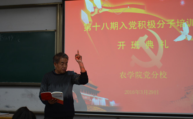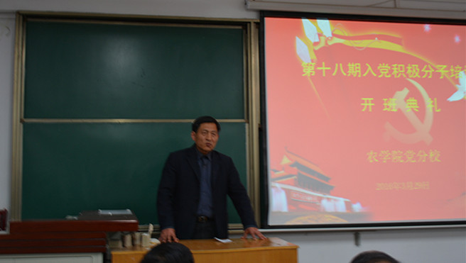 3月29日晚,农学院分党校第18期入党积极分子培训班开班典礼在北校区8308教室成功举行。学院党委书记惠安堂老师、党委副书记马志宏老师、韩怀礼老师、廖代卿老师和杨华老师出席本次开班典礼。典礼由培训班班长聂纪鲁同学主持,122名学员参加了典礼。