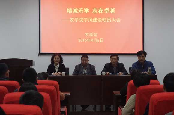 为进一步加强学风建设,营造良好的育人环境。 4月5日晚,农学院召开了“精诚乐学志在卓越”的学风建设专题会议。党委书记惠安堂、副院长海江波、党委副书记马志宏出席,学工秘书彭小凤、教学秘书刘熠、全体本科生辅导员、班主任,团工委学生会主要学生干部与各班班长、团支书参加会议。会议由副院长张蓉主持。