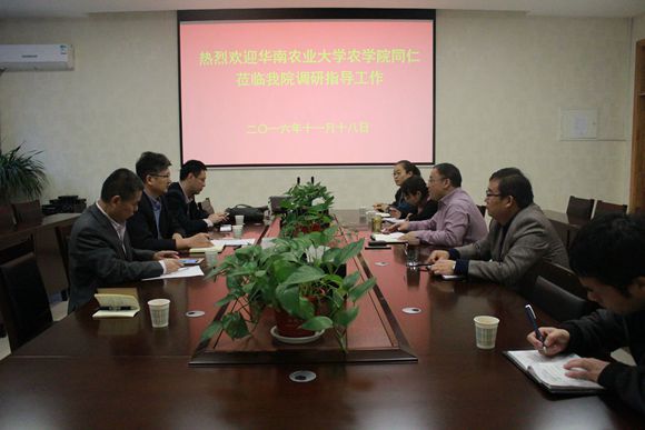 11月18日上午,华南农业大学农学院副院长马启彬带队一行4人来学院调研研究生培养、本科教育、学科建设、十三五规划工作,开展研究生招生宣传,与学院师生进行了座谈和交流。学院党委副书记兼副院长张海成、院长助理冯永忠、副院长海江波、办公室相关人员、教师代表出席了座谈会。